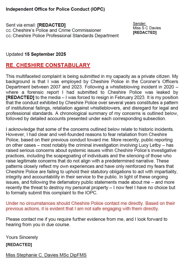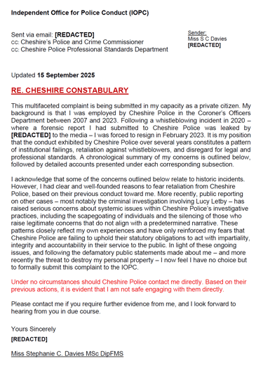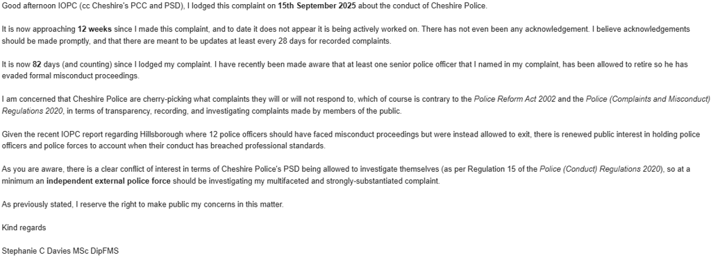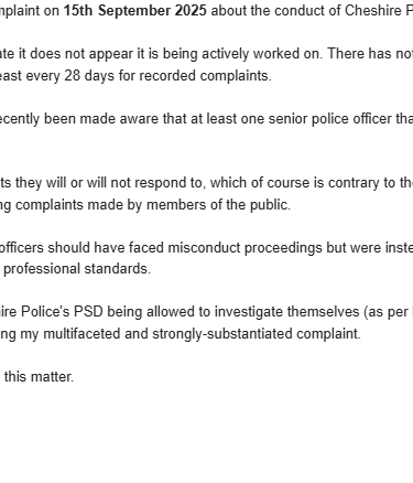 In September 2025, I sent the IOPC a 25-page complaint about Cheshire Police. It covered seven well-substantiated concerns: