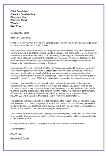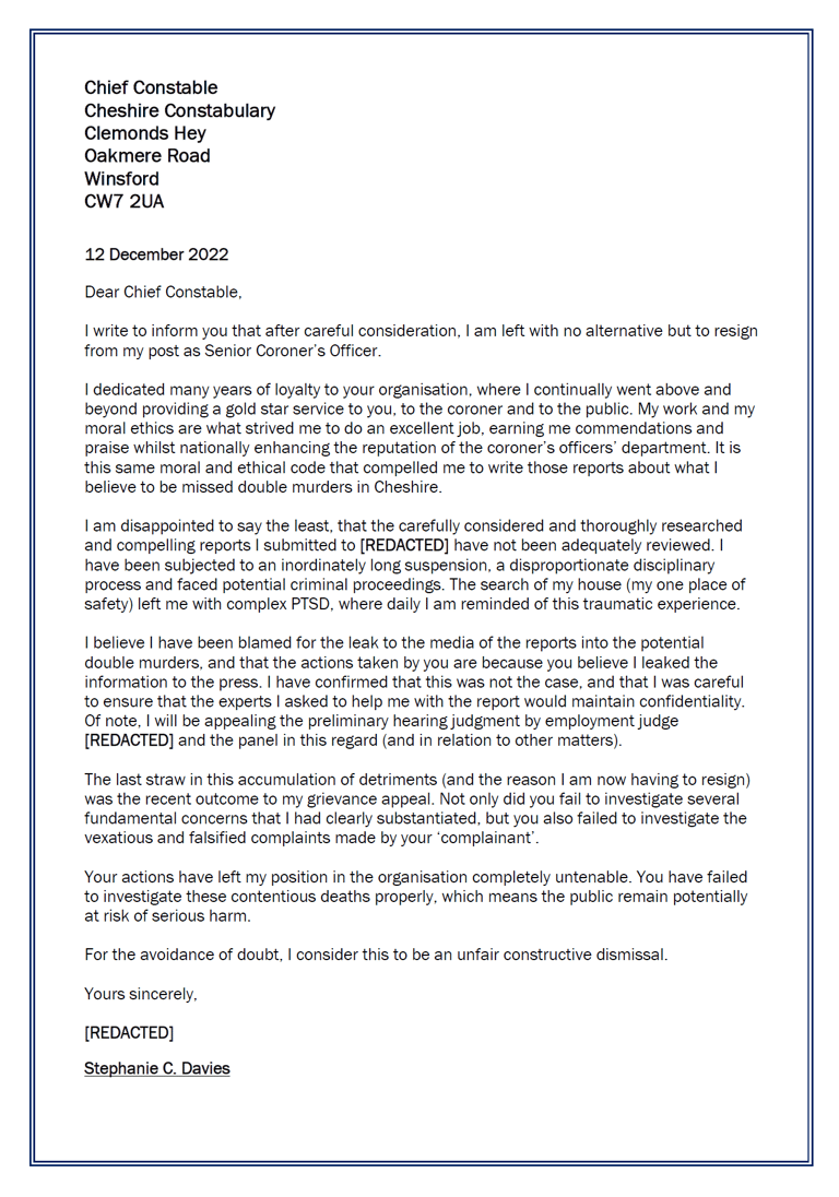 In December 2022, my lawyer advised me to resign from the police as it was clear from my Employment Tribunal what the motivations of Cheshire Police were against me. I did not want to leave the job that I loved and excelled at (plus I knew I had not done anything wrong), but I was left with no choice but to resign.